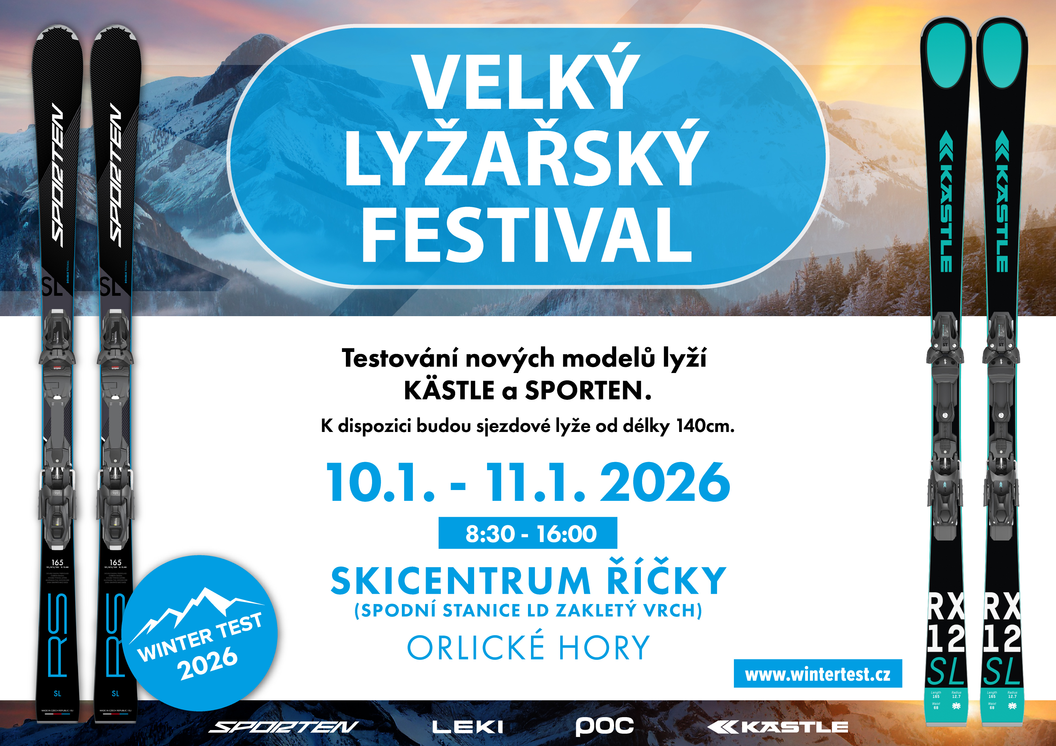 První zastávka v rámci WINTER TESTU 2026 proběhne na spodní stanici LD na Zakletý vrch / Ski centrum Říčky. Těšit se můžete na více než 80 párů sjezdových lyží KÄSTLE a SPORTEN od délky 140 cm. Jste srdečně zváni na náš stánek.